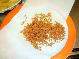 Dann alles mit der warmen gewürzten Kokosmilch übergießen. Backofen auf 200 C Umluft vorheizen. Auf ein Backblech legen 40 g Butterflocken darauf verteilen.